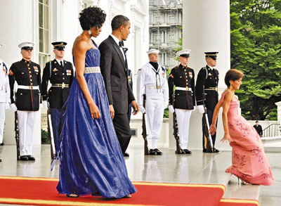 中新網(wǎng)5月21日電 據(jù)香港《文匯報(bào)》報(bào)道,美國(guó)總統(tǒng)奧巴馬19日在白宮設(shè)宴款待來(lái)訪的墨西哥總統(tǒng)時(shí)發(fā)生一段小插曲,白宮的禮儀官準(zhǔn)備迎接貴賓時(shí),忽然跌一跤,整個(gè)人坐在階梯上,受驚的她立刻站起來(lái),開玩笑警告攝影記者不要拍照。