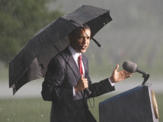 5月31日下午,奧巴馬準(zhǔn)備在林肯國家公墓發(fā)表國殤日演說,正當(dāng)他站上講臺(tái)之際,天空中忽然下起大雨,一時(shí)間雷電交加,風(fēng)也狂吹,一旁的旗幟不停左右搖擺。由于雷雨越下越大,完全沒有趨緩,奧巴馬撐著一把大黑傘,宣布演說暫時(shí)取消。