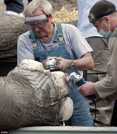 這只名為“男孩”的亞洲象今年已經(jīng)39歲了,他的腳趾甲太長(zhǎng)了以至于他一直感覺很不爽,動(dòng)物園的工作人員看在眼里疼在心上,專門花重金從德國(guó)請(qǐng)來(lái)一名獸醫(yī)和他的多位助手,為“男孩”修理指甲。