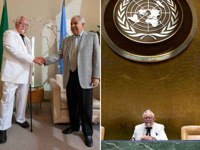 山寨肯德基爺爺混入聯合國總部 與聯大主席拍照