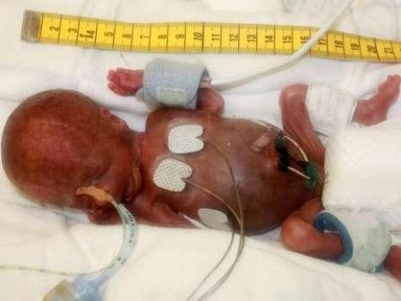 這名男嬰于2009年6月出生,比預產期提前了15周。當時他在母親體內有危險,醫生立即實施了剖腹產。出生時男嬰極其纖弱,大小和一張A4紙差不多,體重只有275克,輕得像一塊黃油。醫生不得不把他放在保育箱里,但是仍然不能保證其成活。經過6個月的精心護理,2009年12月,這名男嬰體重增加到3.7公斤,和一名足月的新生兒差不多大小,順利出院。