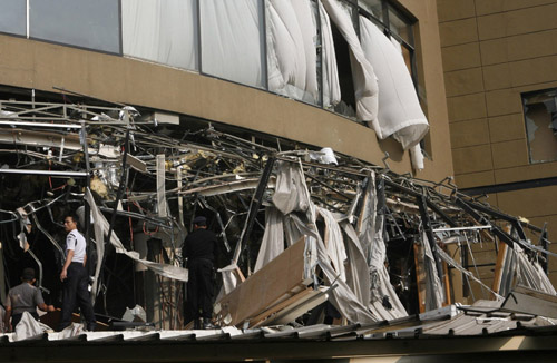 一位在麗思-卡爾頓酒店附近工作的目擊者看見酒店的一些窗戶被炸得粉碎,大部分都是低層的窗戶。酒店外墻受到嚴重損毀,窗戶玻璃炸至粉碎,大量碎片散落在人行道上,萬豪酒店則有煙冒出。據中國駐當地使館人員表示,南航駐當地辦公室距離萬豪酒店不過500米,玻璃被震碎。