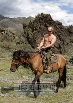 他剛柔相濟。與人握手時,寬肩闊背加上厚重的手掌令你有“鐵腕”之感,但他那坦誠而溫和的藍眼睛又似乎在傳遞俄羅斯的軟實力。訪日閑暇,他換上柔道服,把日本高手摔得服服帖帖;參觀少林寺,他親切地把小沙彌扛到肩頭。他曾獨自應邀到村婦家吃酸蘑菇,安慰這位孑然一身的孤老;他親自開一輛嶄新的國產小汽車,送給為老軍人福利奔忙的耄耋退休女特工。村民邀他游泳,他二話沒說就跳進河里;與運動員合影,他不拘形跡地蹲在前排。