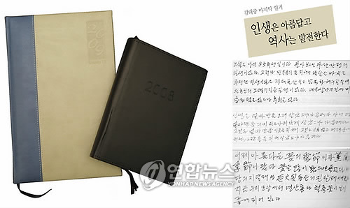 這本小冊子長達(dá)40頁的小冊子中,含有金大中在人生晚年對生活的感悟和作為前總統(tǒng)對時局的認(rèn)識。在日記里,金大中似乎預(yù)見到自己已沒有多少時日,回顧自己波瀾壯闊的人生歷程,寫下了留給后世的“箴言”。他還提到健康問題和對一生伴侶李姬鎬女士的真摯的感情。