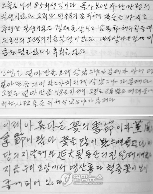 但他還進(jìn)行自我激勵說:“盡管吃了很多苦,但也取得了與眾不同的成功,年齡也已經(jīng)是85歲,在這世界上還有什么可盼的呢?一定要保持健康,為解決民主主義、國民經(jīng)濟(jì)、南北問題等進(jìn)行必要的諫言和努力。”(4月27日)