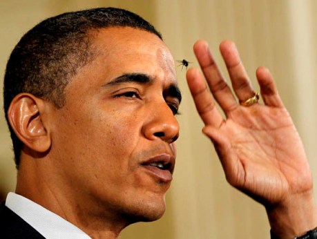 報(bào)道稱,22日,奧巴馬在白宮東廳就醫(yī)改問(wèn)題發(fā)表演講。演講中,一只惱人的蒼蠅不停的在奧巴馬臉旁徘徊,它甚至一度還停在總統(tǒng)的上嘴唇“歇腳”。平日里指點(diǎn)江山的總統(tǒng)面對(duì)這一狀況也顧不上保持形象,數(shù)度中斷演講用手驅(qū)趕縈繞耳邊的蒼蠅。