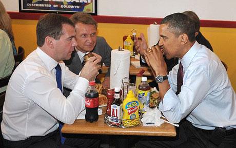 中新網(wǎng)6月25日電 據(jù)外國媒體報(bào)道,24日上午的雙邊會(huì)議結(jié)束后,美國總統(tǒng)奧巴馬帶俄羅斯總統(tǒng)梅德韋杰夫到自己常去的雷氏漢堡店(Ray's Hell Burger),享用漢堡美食。