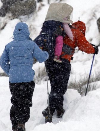 夫妻倆將車停在斯諾登尼亞國(guó)家公園的登山口,帶著女兒,沿著一條小徑開(kāi)始朝山上艱難地邁進(jìn)。他們計(jì)劃攀到高1085米的斯諾登峰山頂。女兒被爸爸背在背上并固定住,臉部用一個(gè)塑料框罩住以防寒。