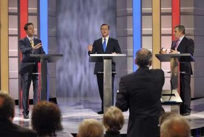 中新網(wǎng)4月16日電 據(jù)法新社報(bào)道,英國(guó)三大政黨黨首15日舉行英國(guó)有史以來(lái)首場(chǎng)選舉電視辯論,事前不那么被看好的自由民主黨黨首克萊格爆冷贏得首場(chǎng)辯論,在辯論后的民意調(diào)查當(dāng)中戰(zhàn)勝執(zhí)政黨工黨黨首布朗和在野保守黨黨首卡梅倫。
