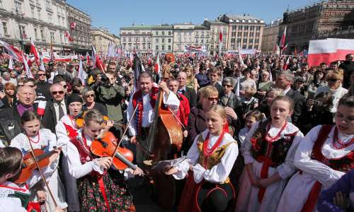 當靈車緩慢穿過克拉科夫狹窄街道時,哀悼者為卡欽斯基夫婦鼓掌、拋花和揮舞波蘭國旗?J斯基夫婦的遺體,是用飛機從華沙運抵這里的。