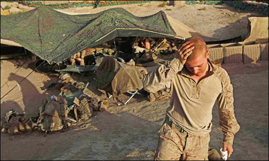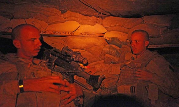 這個觀察哨名為“巖石”,就位于赫爾曼德省哈桑·阿巴德巡邏基地東南部幾百米處,在過去幾個月中,這里一直有2到8名海軍陸戰隊士兵駐扎。這里是一個孤獨暴露的20米高地,2008年夏季被美軍占領。士兵們不僅需要忍受38攝氏度的高溫,還要全天候輪班守衛,眼睛時刻盯著沙袋之間的射擊孔,消遣就是看雜志和去臨時體育館,每個周日早晨,通常會受到塔利班的輕武器和火箭彈的襲擊。
