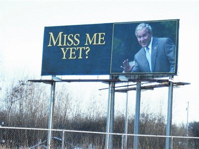 在廣告牌上,右側是一張小布什的照片,左側是一句設計臺詞:“想我了嗎?”