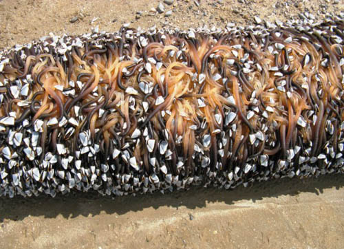 這個奇形怪狀的“生物”出現在斯旺西附近的Oxwich海灘,它通體長約三英尺,外觀像數以萬計的章魚似的皺皮黃褐色觸角緊緊扭絞在一起,觸角上還夾帶著白色貝殼狀生物,隨著海浪詭異地翻滾。一個動物學家稱其“就像《異世奇人》(‘Doctor Who’,英國科幻電視劇)中跑出來的一樣”。來自斯旺西大學的保羅・布萊恩教授也說道:“有個孩子尖叫說這玩意兒和《異世奇人》里的生物太相似了,我不得不同意她的說法,這東西看上去真是怪誕無比”。