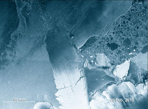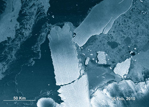據美國《連線》雜志報道,歐洲航天局“ENVISAT”環境觀測衛星上裝載的綜合孔徑雷達拍攝到了南級巨大的冰山相撞的圖片。