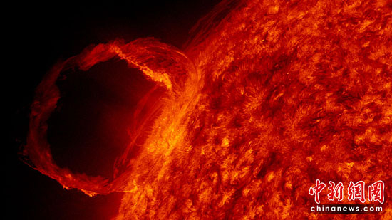 中新網(wǎng)4月23日電 據(jù)日本共同社報(bào)道,美國(guó)宇航局(NASA)日前公布了一幅由2月發(fā)射升空的太陽(yáng)觀測(cè)衛(wèi)星“SDO”拍攝的巨型日珥照片。拍攝時(shí)間為3月30日。據(jù)悉這是首次拍攝到如此清晰的日珥照片,研究人員也對(duì)此頗感驚異。