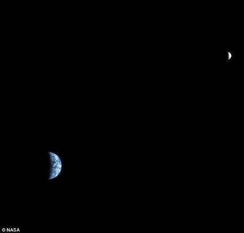 由美國宇航局(NASA)運行火星的軌道探測器拍得的照片,是在繞行火星軌道時拍攝的,在一片漆黑無垠的宇宙中,地球和月球都呈現月牙狀。