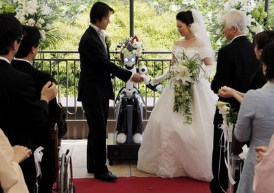 這款高約1.5米的機器人身體主要是白色,頭戴花環,還有兩根塑料辮子。“她”的眼睛可以閃爍,也可以用她細細的嗓音說出“你可以揭開新娘的面紗了”之類的話語,主持起婚禮是有模有樣。