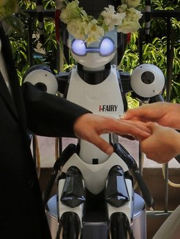 據報道,16日,一對日本新人在東京日比谷公園(Hibiya Park)一間餐館的開放式屋頂上共結連理,面對50多名賓客主持婚禮的,不是人類,而是一款名為“I-Fairy”(小精靈)的“美女”機器人。