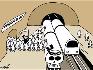這篇題為“莫斯科地鐵襲擊”的漫畫發表在“觀點(Opinion)”欄目內。漫畫將地鐵車頭被畫成“骷髏頭”,額頭還綁著類似阿拉伯文的黑布。急著上地鐵的乘客被畫成白色,人彈被畫成手拿鐮刀的黑色死神。