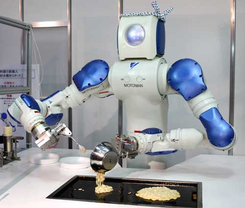 據(jù)悉,國際食品工業(yè)展9日在東京開幕。當(dāng)天,會做飯的機(jī)器人向在場的觀眾大秀技藝,展示只要有材料,機(jī)器人也確實能把面粉做成煎餅的。