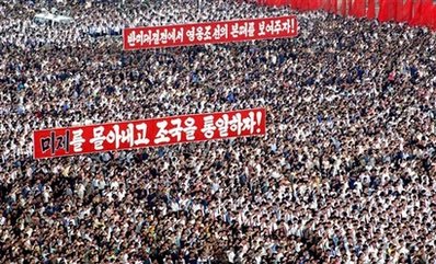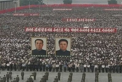 中新網6月26日電 據美聯社等媒體報道,在朝鮮戰爭爆發59周年之際,10萬平壤市民25日在金日成廣場舉行了大規模反美集會(見圖),高呼打倒“美帝國主義”的口號,場面十分壯觀。金日成和金正日的畫像以及反美標語到處可見。