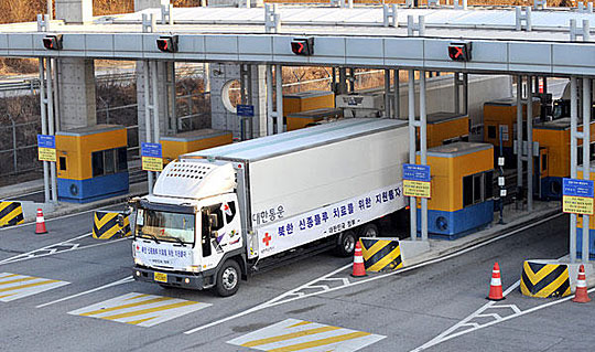 在韓國坡州,裝載有援助朝鮮防控甲型H1N1流感藥物的貨車通過關卡。