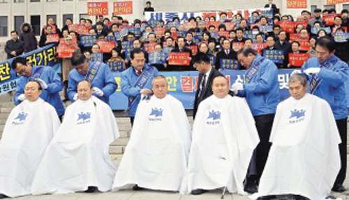 韓國政府宣布放棄遷都計劃,反對這項計劃的反對黨人士11日在國會剃光頭表示抗議。