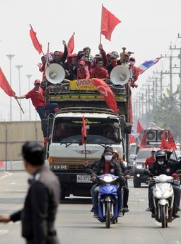據(jù)報道,尤其是在曼谷皇家田廣場一帶,到處都可見紅衫軍的車隊和旗幟。12日,“反獨(dú)裁民主聯(lián)合陣線”先進(jìn)行熱身,在市內(nèi)6處地點(diǎn)進(jìn)行集會,作為14日大集會的前奏。