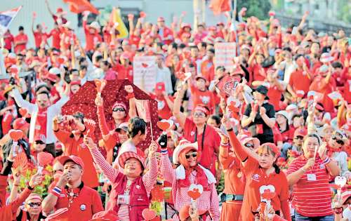 紅衫軍領袖宣稱,今天中午以前,會有100萬人集結。泰國當局出動了五萬名軍警。昨天夜里,他信到支持他的電視臺,否認外傳他被阿拉伯聯合酋長國驅逐出境、現在人在柬埔寨,他宣稱正在歐洲訪問。