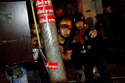泰國軍隊19日清晨進駐曼谷市是隆路(Silom)后,紅衫軍這三天來緊守拉差帕頌路口(Ratchaprasong)鬧區示威地點,并運來大批竹子、輪胎、網子圍住示威地點路口,與是隆路就隔著一條馬路,緊張氣氛每天都在升高,軍隊將展開鎮壓的傳聞越來越多。
