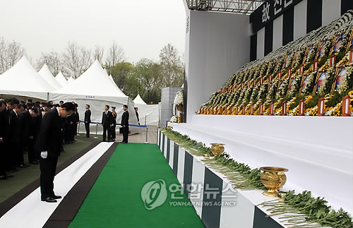 中新網(wǎng)4月26日電 據(jù)韓聯(lián)社報(bào)道,韓國總統(tǒng)李明博26日上午訪問設(shè)在首爾廣場的“天安”艦吊唁所,吊唁犧牲官兵。當(dāng)天韓國總統(tǒng)府青瓦臺秘書等行政人員陪同李明博前來吊唁。