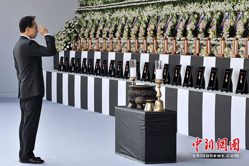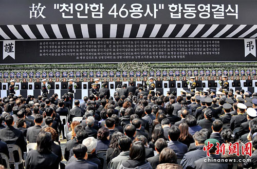 當(dāng)天的遺體告別儀式以對(duì)犧牲官兵的敬禮和默哀開(kāi)始,然后向46名為國(guó)獻(xiàn)身的官兵追封花郎武功勛章。之后,韓國(guó)海軍總參謀長(zhǎng)金盛贊朗讀吊唁詞,天安艦甲板副士官金玄來(lái)(音)朗讀了追悼詞。