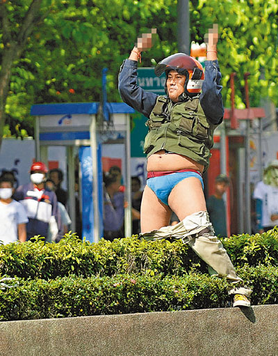 死硬派示威者爬上路中心石礐,脫下褲子,挑釁士兵。