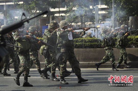 據當地媒體報道,15日下午,泰陸軍已宣布曼谷拉差帕宋作為一個實彈射擊區,禁止公眾進入反政府示威者與士兵發生沖突加劇的這一有限區域。軍隊也提出警告,新聞記者也不得進入拉差帕宋。