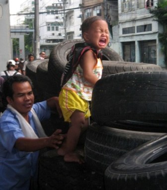 有關這名男童在示威者和泰國士兵對峙前線的視頻已被上傳至網站,包括婦女和兒童在內的5000名紅衫軍示威者正為軍方把他們從營地里強行驅逐出去作準備。