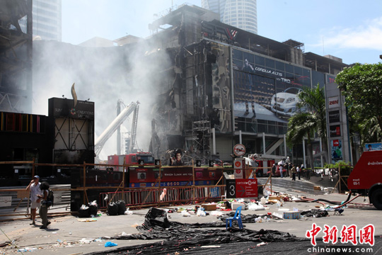 離此咫尺之遙的便是曾被曼谷人引以為豪、號稱亞洲第二大的森特沃購物中心,19日下午被人放火燃燒。記者在現場看到,該樓的部分建筑已經垮塌,三支高壓水龍正對著垮塌處噴水。據稱,當天搜救人員從廢墟中發現一年齡大約35歲男子的尸體。官方初步估計,曼谷19日晚至20日晨火災造成的損失或達數十億美元。