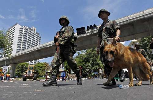 泰國軍警攜警犬搜索紅衫軍有沒有留下危險物品。