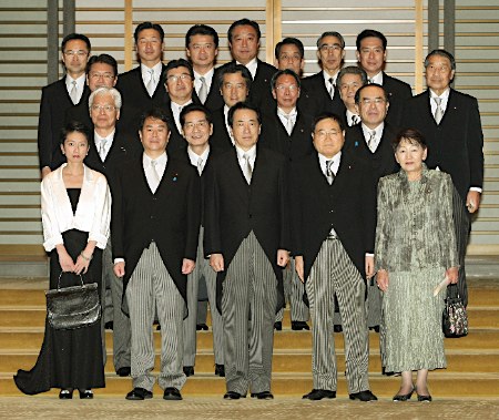 6月8日晚,日本天皇在天皇宮中舉行儀式,任命菅直人擔任日本新首相,同時一一任命了其它17名大臣。圖為菅直人率閣員合影。