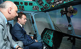 Tranzas公司方面向梅德韋杰夫展示了為專業(yè)飛行員制造的高級訓(xùn)練臺。它能夠模擬在俄羅斯最受歡迎的米格-8型直升機(jī)的飛行。公司學(xué)習(xí)部門的主任葉甫蓋尼·阿巴庫莫夫和梅德韋杰夫一起坐在米格-8直升機(jī)的方向盤前,在圣彼得堡阿德列爾機(jī)場最不利的條件下進(jìn)行了一次駕駛。