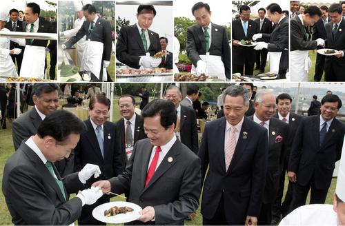 在蒙蒙細雨中東盟領導人手舉雨傘進入了午宴會場,而李明博戴著手套、身穿圍裙在炭爐前親自烤肉,吸引了各國領導人的目光。