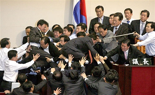 韓國國會議員2007年12月14日因一項彈劾檢察官的提案而發生大規模群毆,這些檢察官為呼聲最高的總統候選人李明博清除了詐欺罪嫌。據“中央社”報道,在大約100名在野黨籍議員以桌椅阻擋國會主要議事廳的出入口后,一群親政府的議員被迫穿越圍欄以設法進入議事廳。 chinanews發 攝