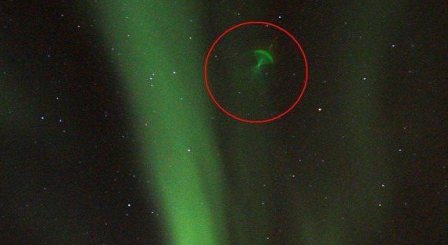 在一張他于1月21日拍攝的照片中,右上方有一個像綠色水母,又像降落傘的奇怪物體。米凱森描述說,“這個物體影像具有跟北極光相同的綠色。這意味著北極光是造成這個物體成影的光源。”