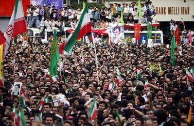 據英國廣播公司報道,周日,狂喜的支持者高舉伊朗國旗和艾哈邁迪內賈德的大幅照片,涌入德黑蘭的主要街道,慶祝艾哈邁迪內賈德大選勝利。