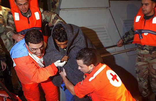 12月18日黎巴嫩的黎波里港,救援人員救起沉船事件的幸存者。