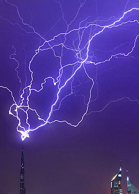 盡管當時穆罕默德所在的位置離哈利法塔超過1英里,但從照片中,人們還是可以很清晰地看到閃電的數條藍色弧光。穆罕默德高興地說,他能拍到這樣的場面真是太幸運了,因為相機是他剛剛才買的。他說:“迪拜出現暴雨天氣的情況很少見,因此我急忙趕到戶外來觀賞,而當我正在拍攝天空的時候,卻意外捕獲了這樣難得一見的奇觀! 據了解,離地面2至3英里(約3至5公里)的閃電平均可以產生超過1億伏的電壓。(Zak)