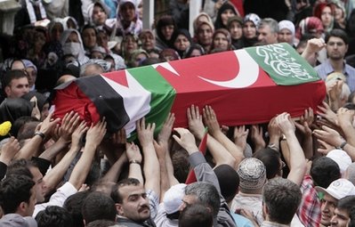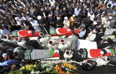 周四(3日),九名死者的尸體被從以色列運(yùn)回土耳其。450多名活動人士也一同抵達(dá),他們受到英雄般的歡迎。九名死者都是土耳其人或出生在土耳其,他們的棺材上覆蓋著土耳其和巴勒斯坦的國旗。