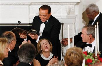 此前媒體的報道說,即將離任的美國總統布什在白宮為來訪的貝盧斯科尼舉行了晚宴,兩人在宴會上表現的非常親密,在舉杯后互碰面頰,布什總統還愉快地致了告別辭。一位官員稱:“政治家們表現得如此親密是不多見的,他們看起來更像是好友而不是世界領導人。”
