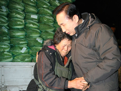 在市場賣蘿卜的一名樸姓奶奶久久地握著李明博的手不放,李明博問她:“一天能賺多少錢?”,樸姓奶奶答說:“平均2萬元左右。生意好的時候,可以賺3萬元!保又_始掉下眼淚。