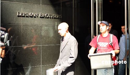 9月15日,美國有著158年歷史的第4大投資銀行雷曼兄弟公司于向法院申請破產保護,員工當日從雷曼兄弟公司位于紐約的總部大樓內將清理的辦公用品搬離公司。中新社發 鄧悅 攝