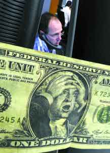 對金融危機的過度樂觀讓眾多名人預(yù)測失誤,圖為一張美元假鈔上抱頭作驚訝狀的人像